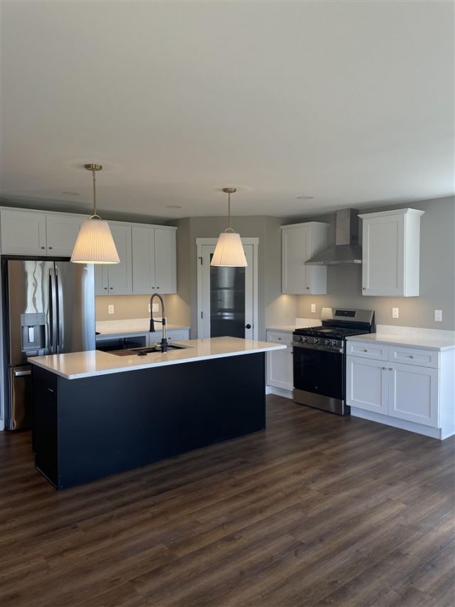 NEW Construction Ranch Plan with 3-Car Garage. Photos of a similar home. Estimated Completion is fall 2026. This 4-bedroom, 3 full bath home features a kitchen that serves as the heart of the space, showcasing a striking treasure chest island with white countertops, a farmhouse sink, and a spacious walk-in pantry. White perimeter cabinetry with matching countertops pairs beautifully with stainless steel appliances and timeless gold accents in the lighting and hardware. Just off the garage, an oversized mudroom and laundry room adds everyday convenience and functionality, and is thoughtfully connected to the primary suite's walk-in closet for added ease.
