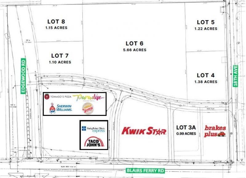 Pecks Landing, a master-planned 18-acre retail power center offers excellent visibility near the northeast quadrant of Cedar Rapids off Blairs Ferry Road and Edgewood Road NE where daily traffic counts exceed 35,000. Pecks Landing is part of a rapidly expanding residential and commercial sub-market surrounded by a variety of business and medical offices, retail, grocery, gas/convenience, service businesses, salons/spas, fitness centers and residential neighborhoods. Edgewood Road NE provides direct connection to major roadways such as Blairs Ferry Road, I-380, and Highway 100/Collins Road extension. A 200,000 square foot Fleet Farm store and active Hy-Vee Grocery in neighboring developments, combined with excellent demographics, produce the areas premium retail and office opportunities. Pecks Landing has an opportunity for commercial land purchase like nothing else in the market. There are currently three lots for sale with the ability to combine, and build-to-suit options.