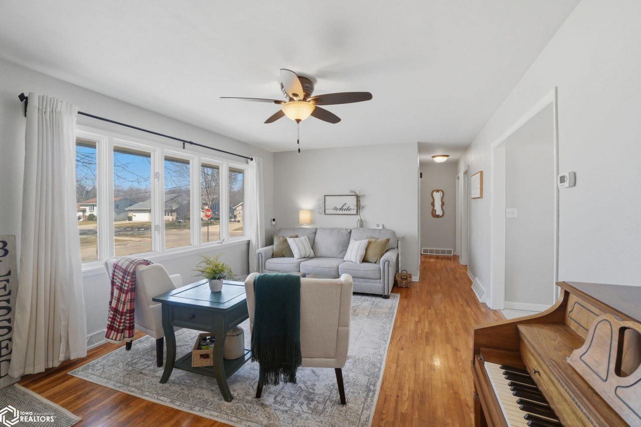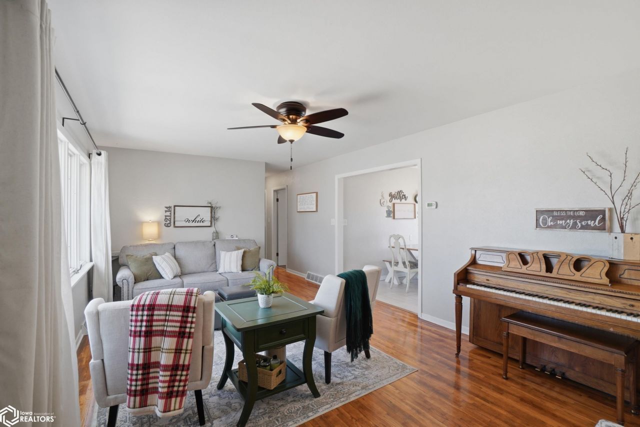 Super cute Ranch home offering lots of updates and corner lot in convenient location near retail, Hwy 218 & Hwy 34, Mapleleaf Athletic Complex and elementary school. Main floor offers large living room with plenty of natural light, original refinished hardwood floors, 3 bedrooms, remodeled full bath including tile floor and tile surround shower. Eat in kitchen with island, newer tile floor, all stainless steel appliances staying, newer vinyl sliding door to rear composite deck, vinyl privacy fence and fire ring area for bonus entertaining space. Lower level provides large open family room with gas fireplace, non-conforming bedroom/den, large laundry area including newer 3/4 bath and plenty of storage too! Enjoy the extra deep attached garage to store additional items or have a work bench area. This home is ready to be your new address!