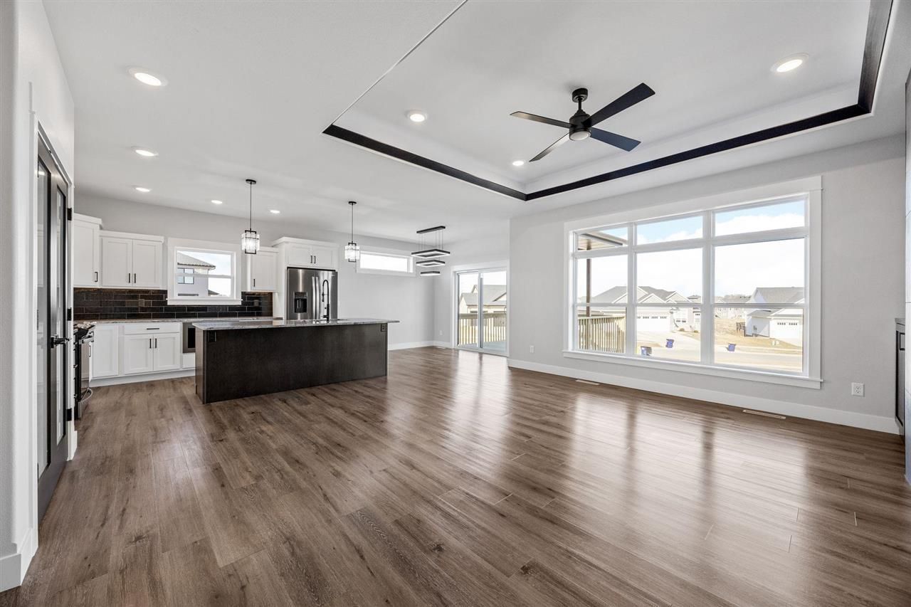 K&A NEW CONSTRUCTION HOME WITH 2,809 FINISHED SQUARE FEET RANCH IN HIGH DEMAND GREENBELT TRAIL DEVELOPMENT. LUXURIES OF FINE MILLWORK, MISSION STYLE DOOR AND WINDOW HEADERS, 5-INCH-TALL BASE TRIM, 10' GREAT ROOM CEILING WITH AN INVERTED TRAY AND CROWN MOLDING. THE FIREPLACE IS CASED WITH STACKED STONE AND WIRED FOR HDMI TV OUTLETS. PRIMARY BEDROOM INVERTED TRAY CEILING, BATH WITH DOUBLE VANITY SINKS, QUARTZ COUNTERS, AND WALK IN TILE SHOWER. THE KITCHEN IS THE HEART OF THE HOME WITH FINE DETAILING, DOVETAIL SOFT CLOSE DRAWER CABINETRY, WALK IN PANTRY AND COUNTER HEIGHT ISLAND WITH BAR SEATING. WELL DESIGNED FLOOR PLAN WITH A LAUNDRY DROP ZONE, CUSTOM IRON RAILING TO THE WALKOUT LOWER LEVEL, POCKET OFFICE, COVERED DECK WITH STAIRS. FINISHED LOWER LEVEL WITH A RECREATION ROOM, WET BAR, 2 BEDROOMS AND A FULL BATHROOM. 8'X16' AND 9'X8' INSULATED GARAGE DOORS, FULLY INSULATED GARAGE, DRYWALL FINISHED AND PAINTED. WRITTEN K&A BUILDER WARRANTY. SPECIFICATIONS SUBJECT TO CHANGE. HOME IS UNDER CONSTRUCTION AND PHOTOS ARE OF A SIMILAR PROPERTY.